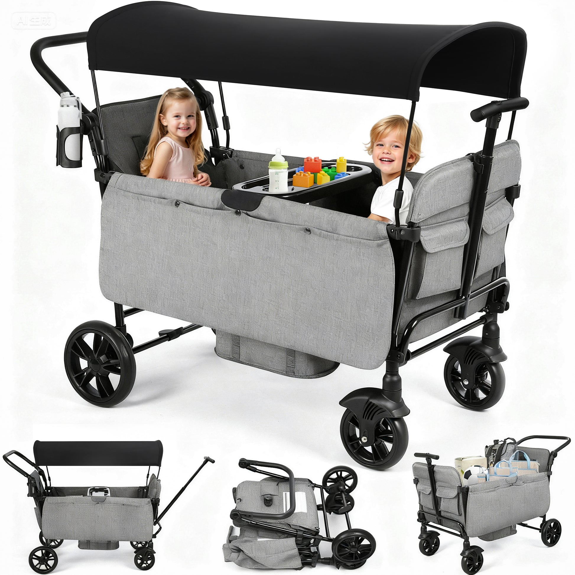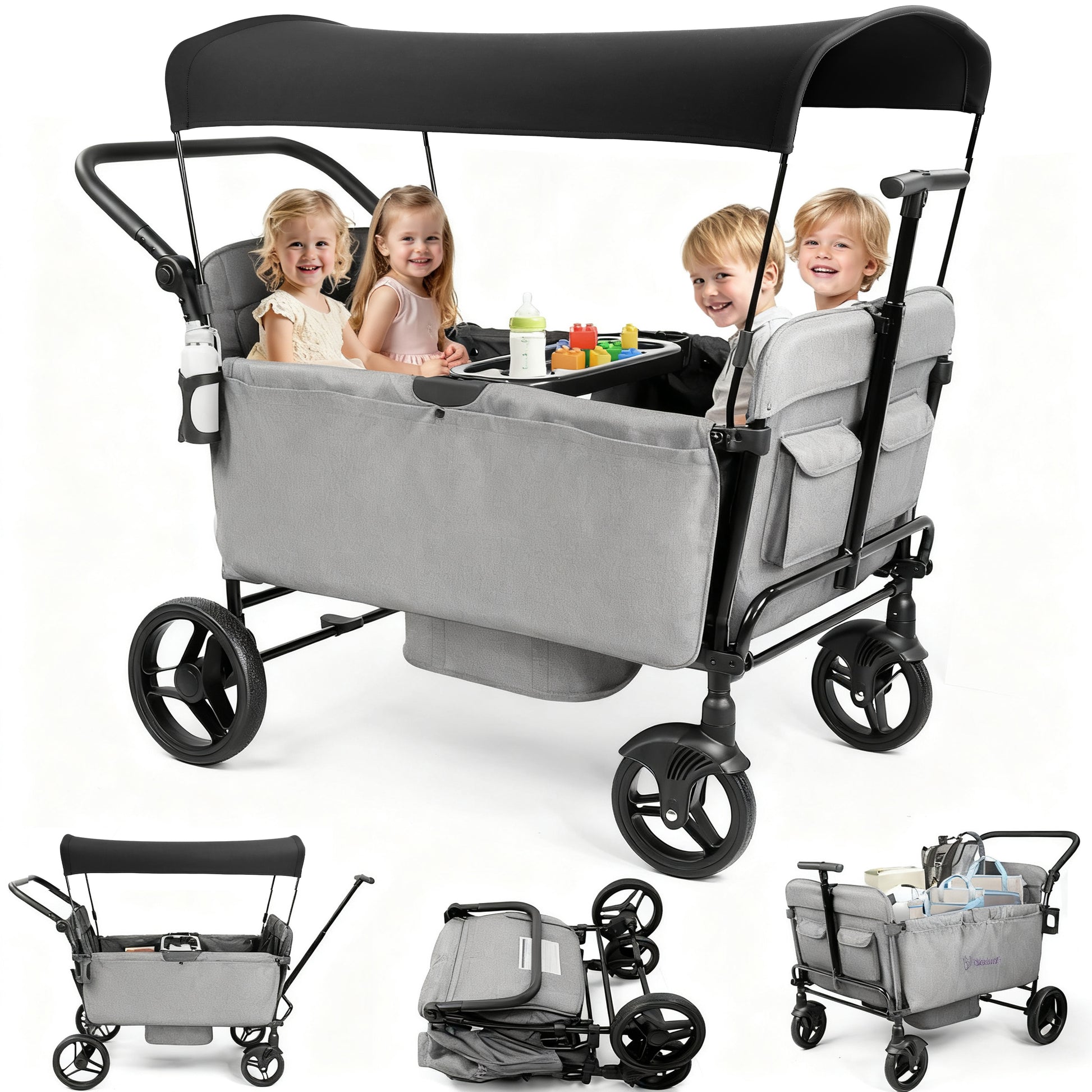 Vomeast Wagon Stroller for Kids, Spacious 2/4-Seater Stroller Wagon with Adjustable Canopy, Pull & Push Handle, 5-Point Harness, Foldable for Toddlers